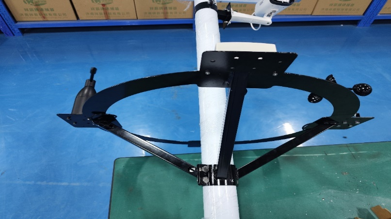 13、安裝固定圓盤支架并穿線,先將圓盤支架中間四個(gè)螺絲拆卸,然后將圓盤支架從燈桿上方套到燈桿上,光照傳感器朝向控制箱方向,將傳感器線從對(duì)應(yīng)的進(jìn)線孔(距燈桿頂端1m)穿進(jìn)燈桿,從控制箱的出線孔(離燈桿底座1.2m)穿出燈桿,最后將圓盤支架4個(gè)穿線孔與燈桿的4個(gè)進(jìn)線孔對(duì)齊,固定4個(gè)螺絲并擰緊,注意不要壓到線