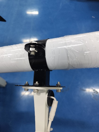 14、安裝固定槍機(jī)攝像頭,將槍機(jī)與槍機(jī)支架(白色)固定,槍機(jī)線穿入槍機(jī)支架內(nèi),連接一根網(wǎng)線(7m藍(lán)色網(wǎng)線)及電源線(DC插頭線),然后與槍機(jī)連接件(黑色)固定,接頭留在槍機(jī)支架內(nèi)(接頭用防水膠布纏住),最后將網(wǎng)線、電源線從燈桿頂部30cm穿線孔處穿入燈桿,從控制箱的出線孔(離燈桿底座1.2m)穿出燈桿,將連接件與燈桿固定完成