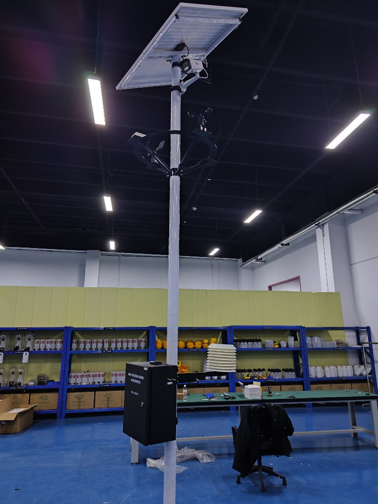 20、設(shè)備安裝完成(注:電池線從燈桿底部穿入控制箱;葉面溫濕度傳感器線從控制箱底部穿入控制箱,傳感器固定于樹枝枝干上)
